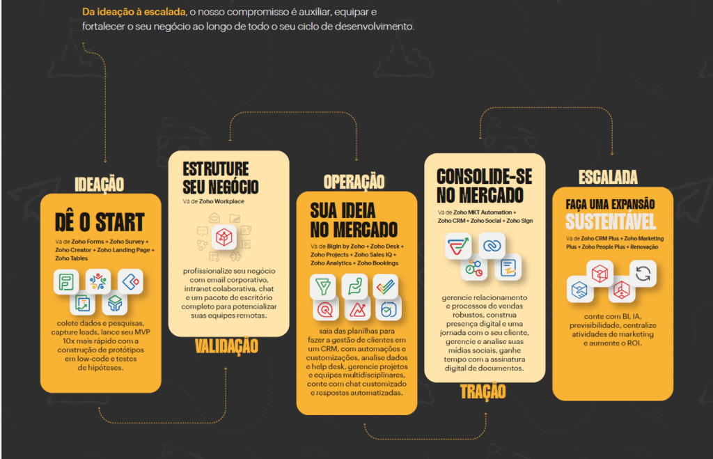 O programa Zoho for Startups é uma iniciativa desenhada para auxiliar, equipar e fortalecer o seu negócio ao longo de todo o ciclo de desenvolvimento, da ideação à escalada.